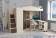 Спальное место размером 1900 х 800 мм находится на втором ярусе, что освобождает больше пространства на полу. Под кроватью располагается рабочая зона с поворотным столом на колесах, который можно легко перемещать и адаптировать под любые задачи — от уроков до творчества.