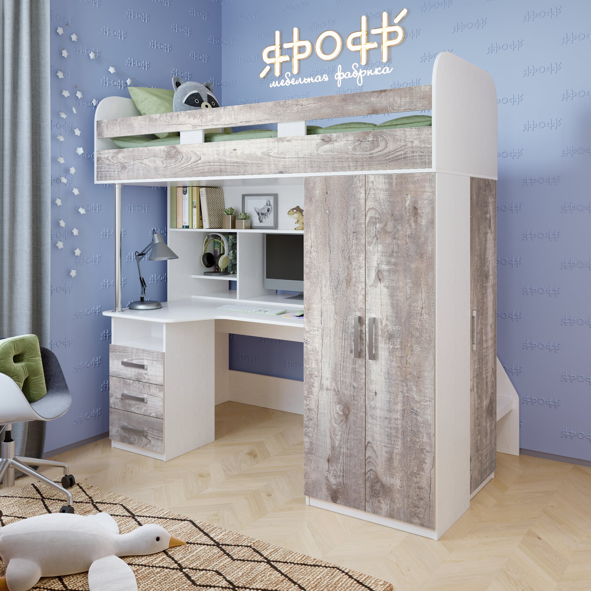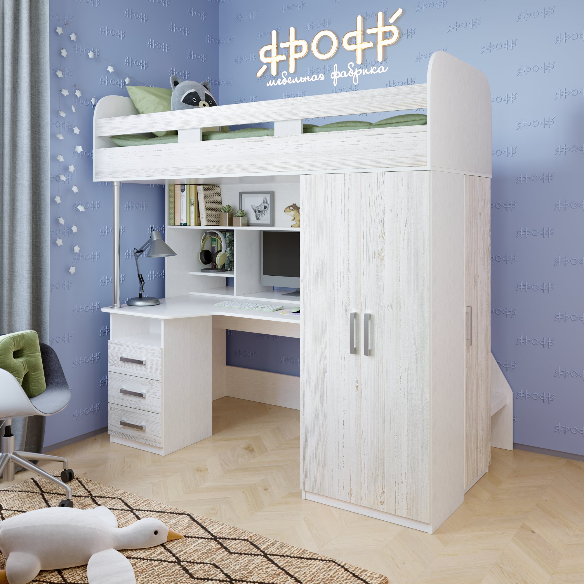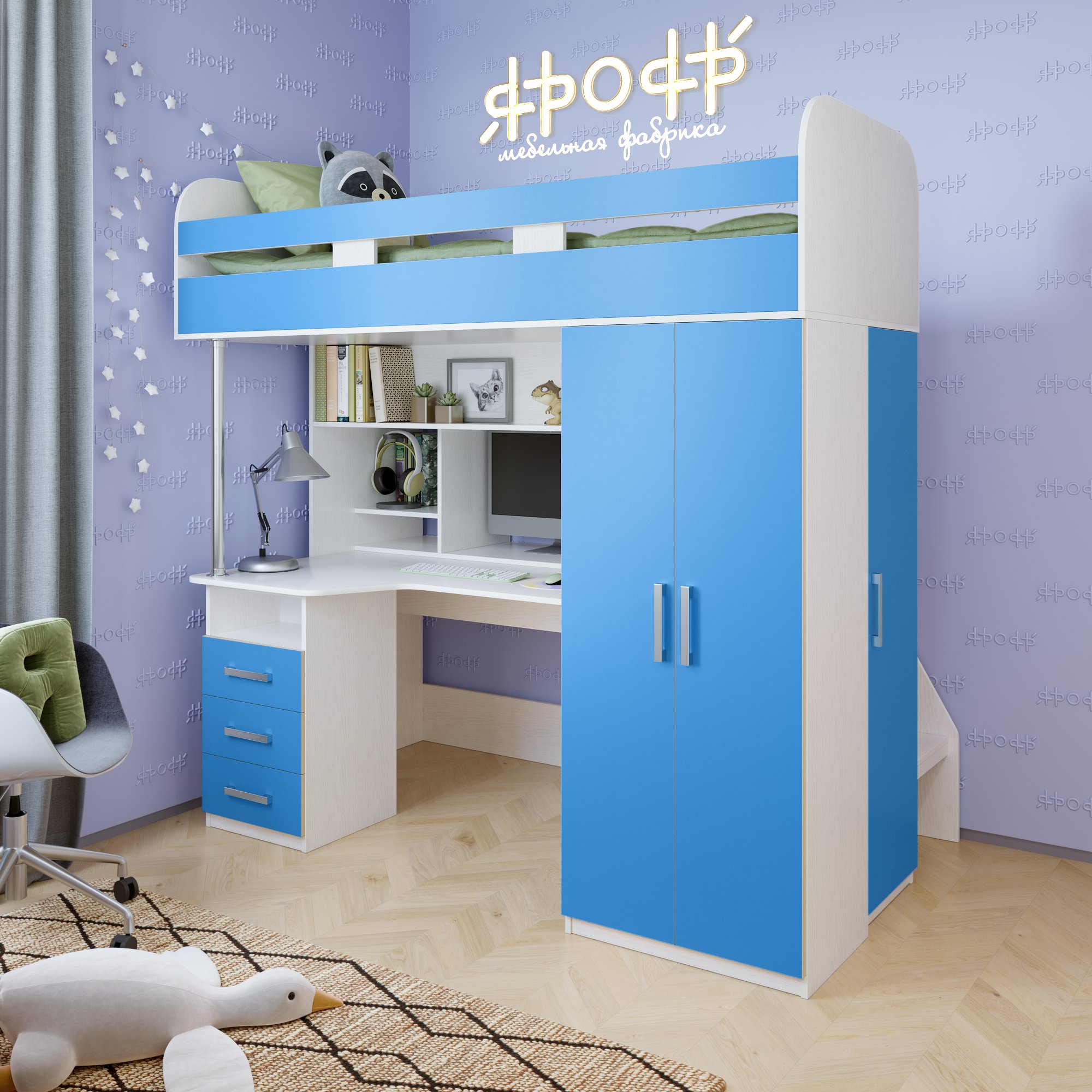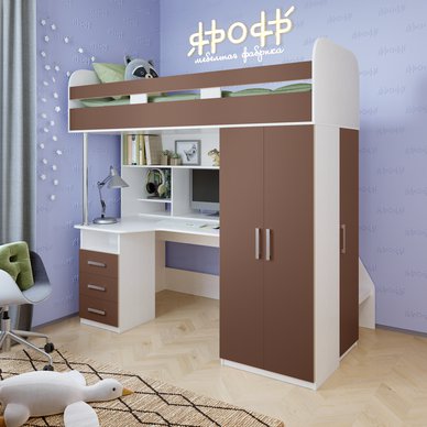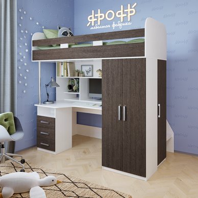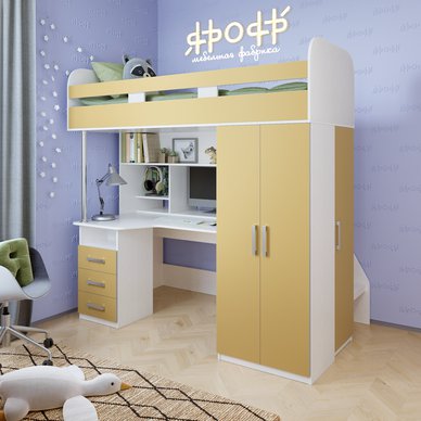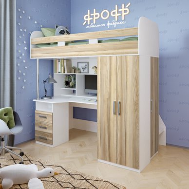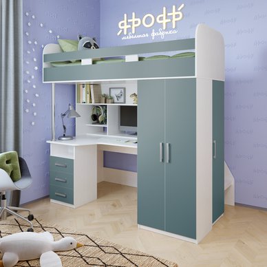 Кровать-чердак «Аракс» - практичная и многофункциональная мебель для комнаты школьника младших и даже старших классов. Современная и стильная мебель для детской, которая предусматривает все необходимое: удобную кровать, большой и вместительный шкаф, просторный стол для учебы и выполнения домашних зданий, на котором есть место для компьютера, открытые полки, а под ним – встроенная тумбочка с ящиками.
