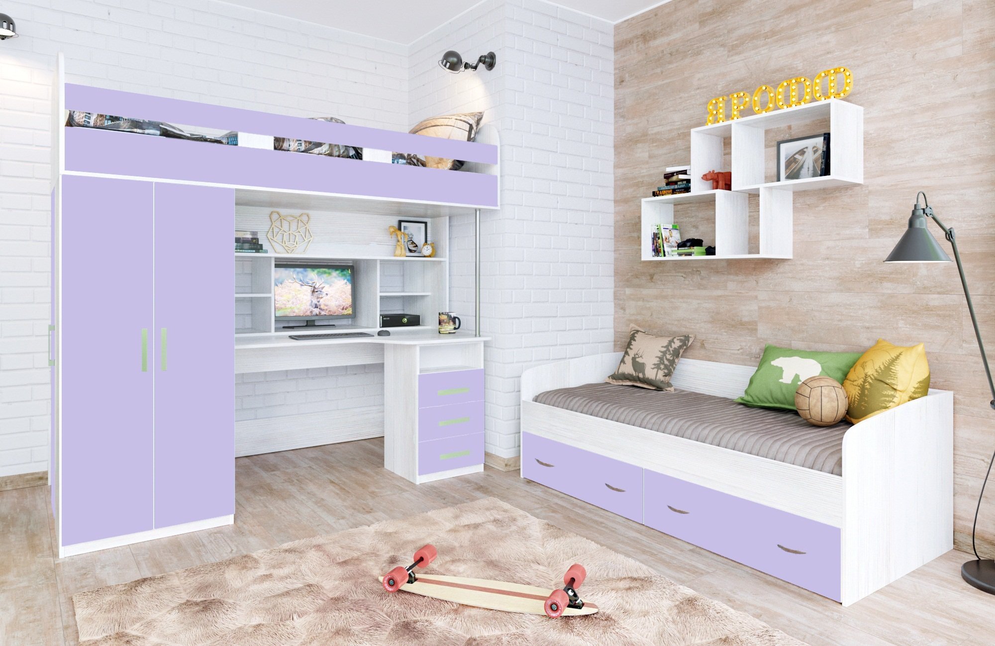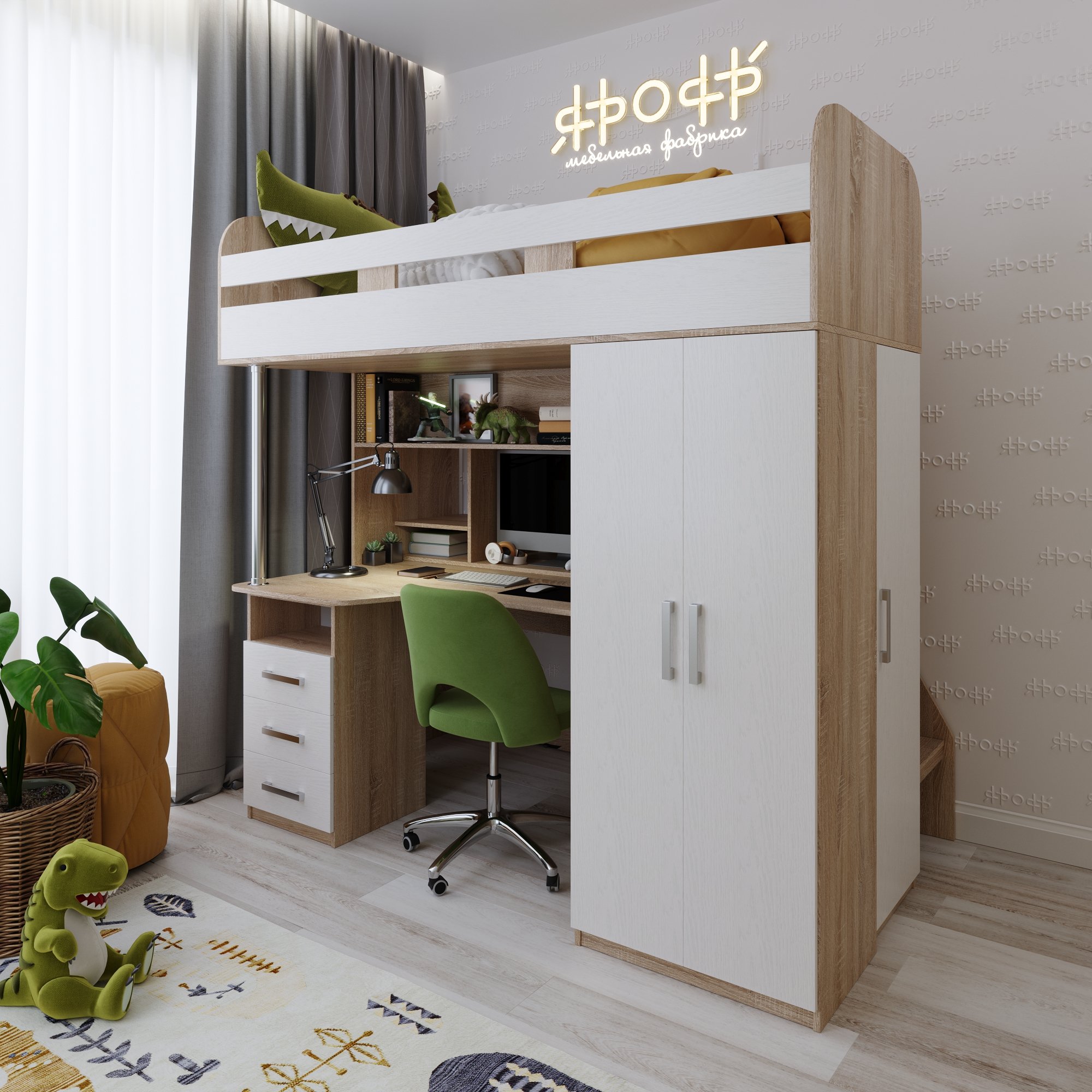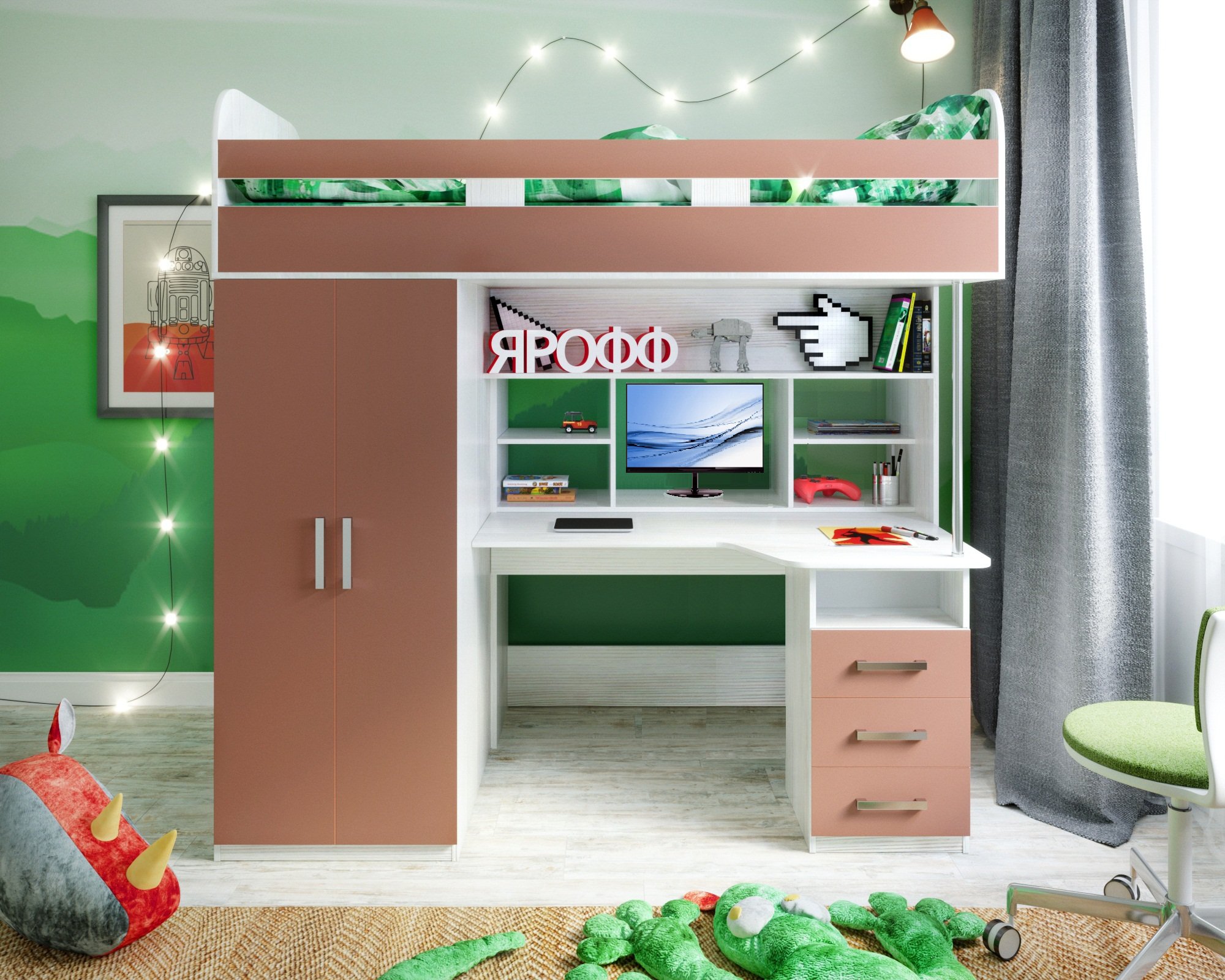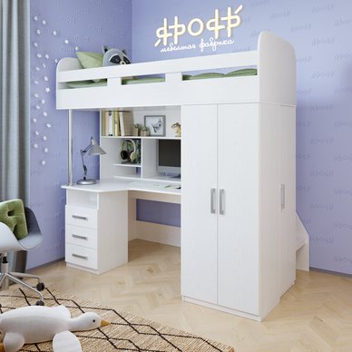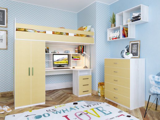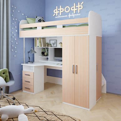 Кровать-чердак «Аракс» - практичная и многофункциональная мебель для комнаты школьника младших и даже старших классов. Современная и стильная мебель для детской, которая предусматривает все необходимое: удобную кровать, большой и вместительный шкаф, просторный стол для учебы и выполнения домашних зданий, на котором есть место для компьютера, открытые полки, а под ним – встроенная тумбочка с ящиками.