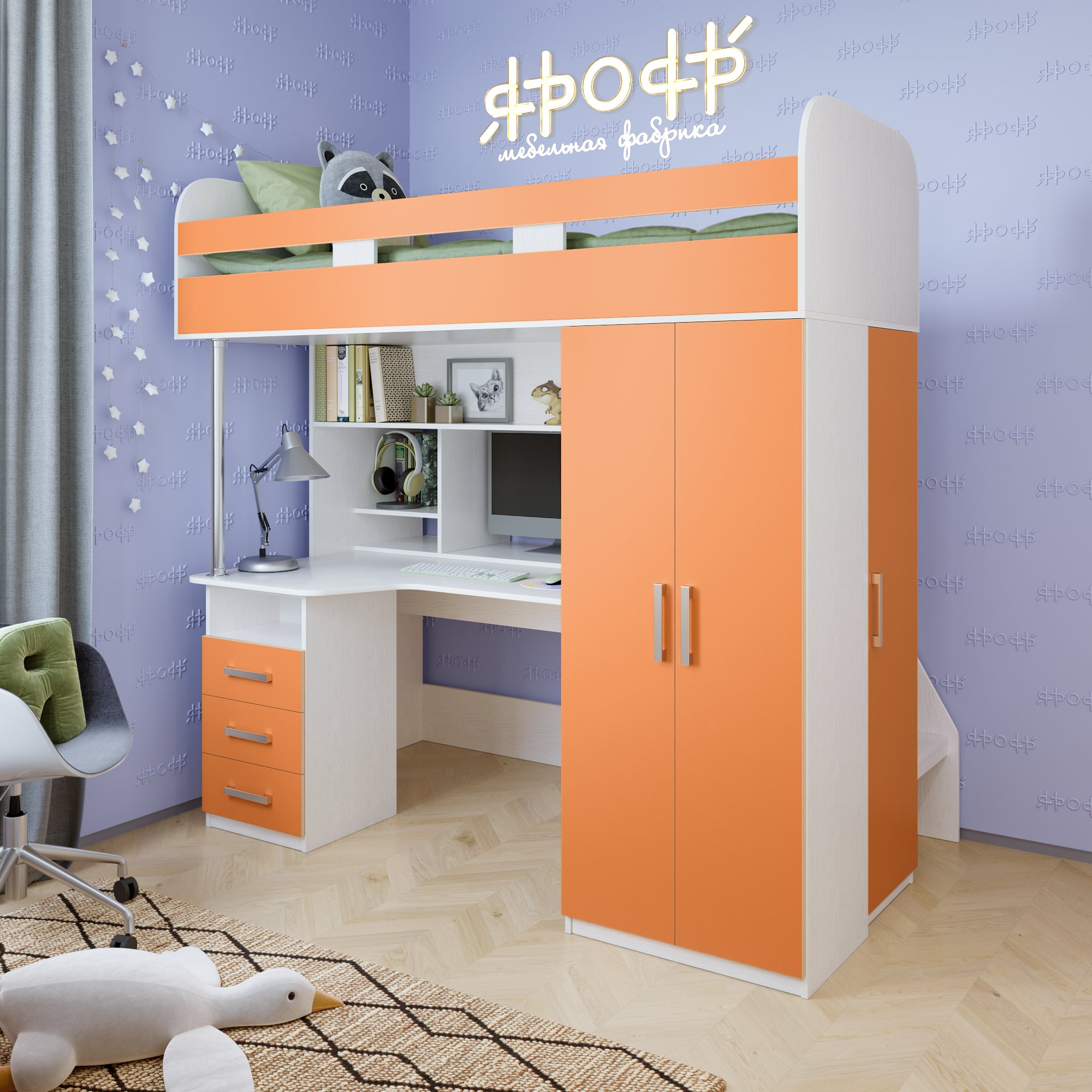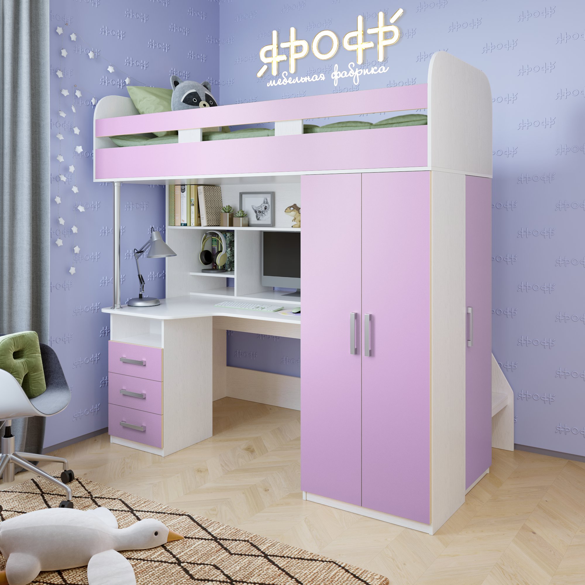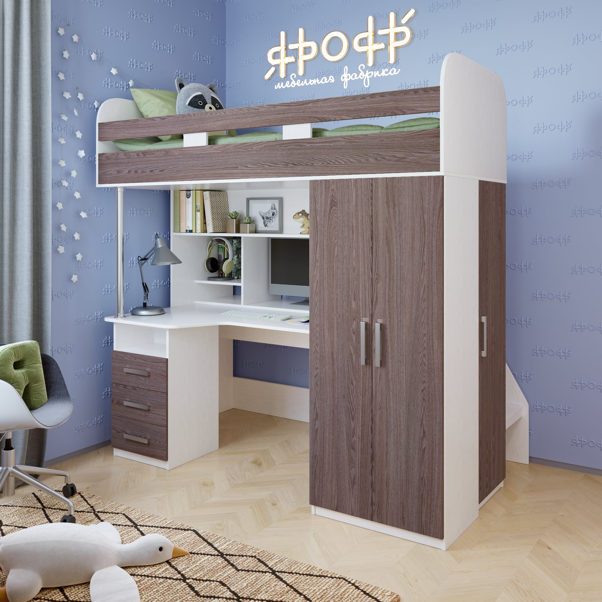 Кровать-чердак «Аракс» - практичная и многофункциональная мебель для комнаты школьника младших и даже старших классов. Современная и стильная мебель для детской, которая предусматривает все необходимое: удобную кровать, большой и вместительный шкаф, просторный стол для учебы и выполнения домашних зданий, на котором есть место для компьютера, открытые полки, а под ним – встроенная тумбочка с ящиками.
