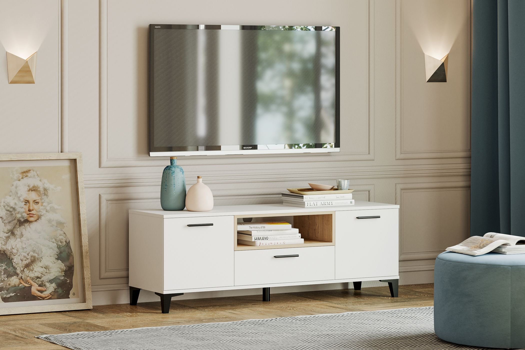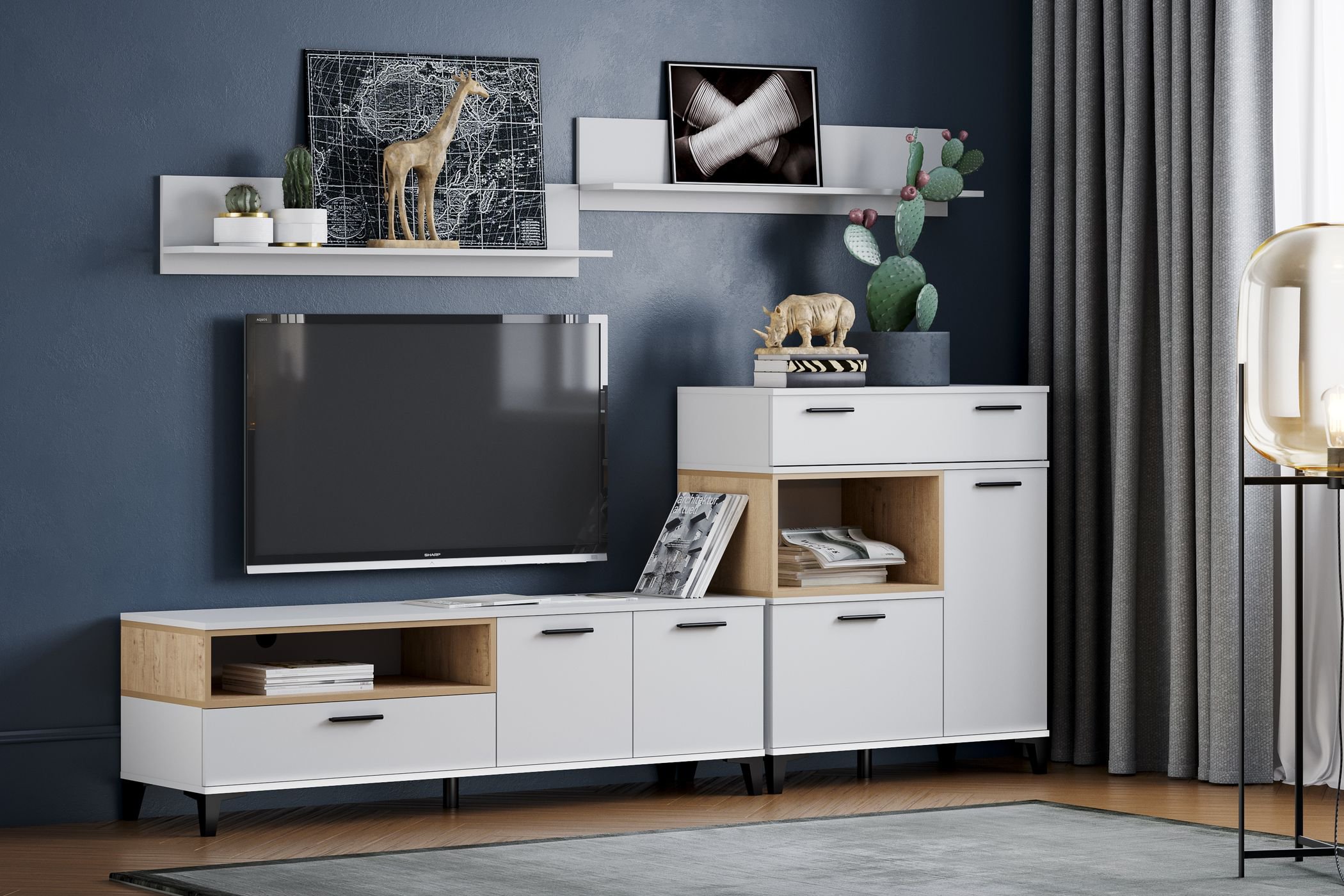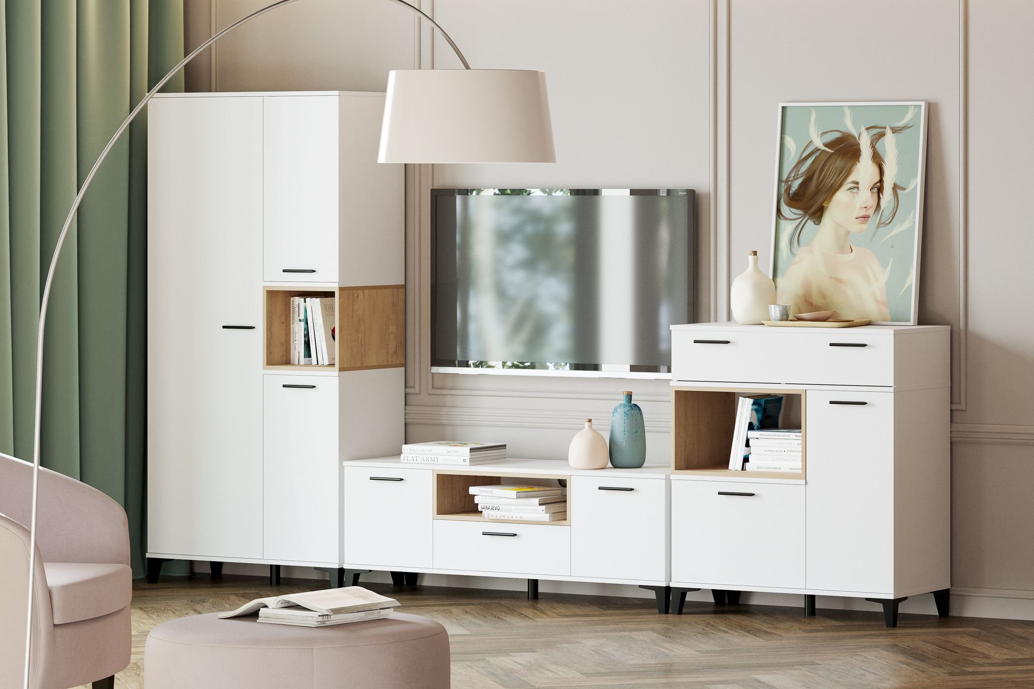 Современная модульная система для гостиной. Сочетание цвета Белый, Дуб Бунратти.