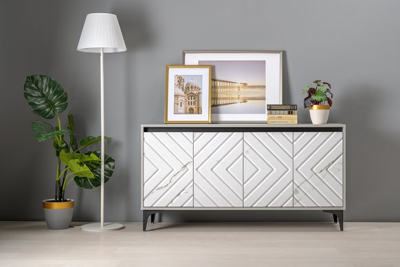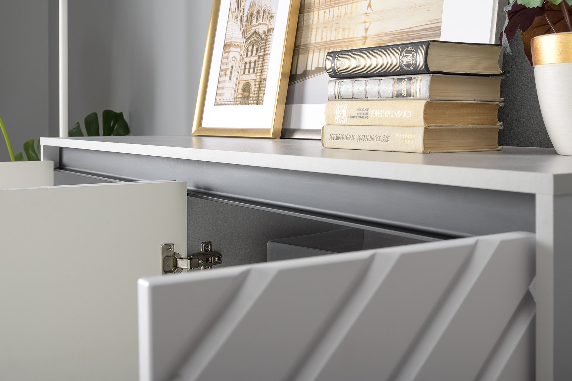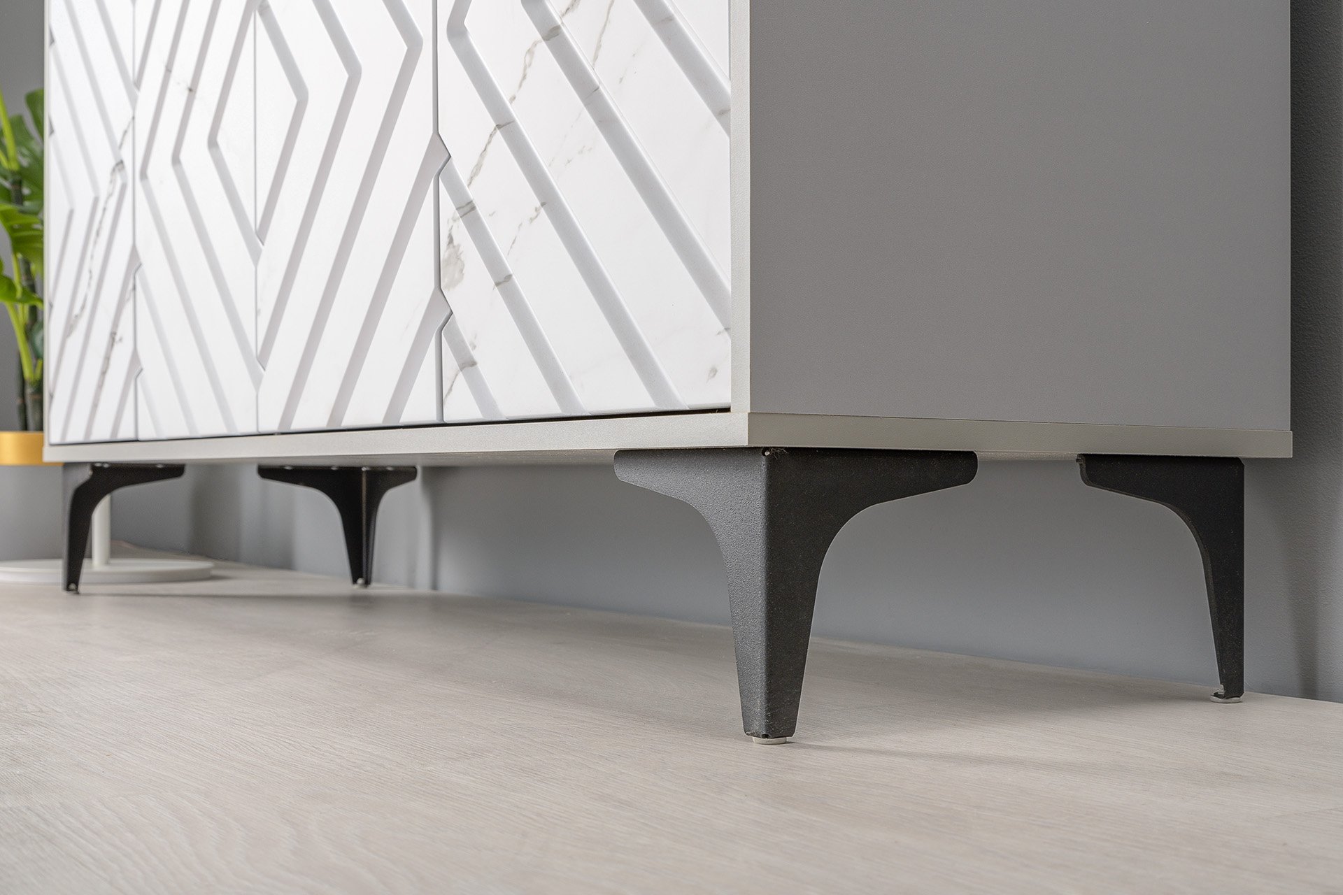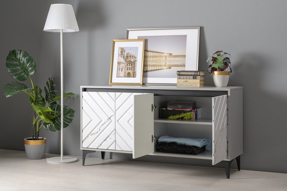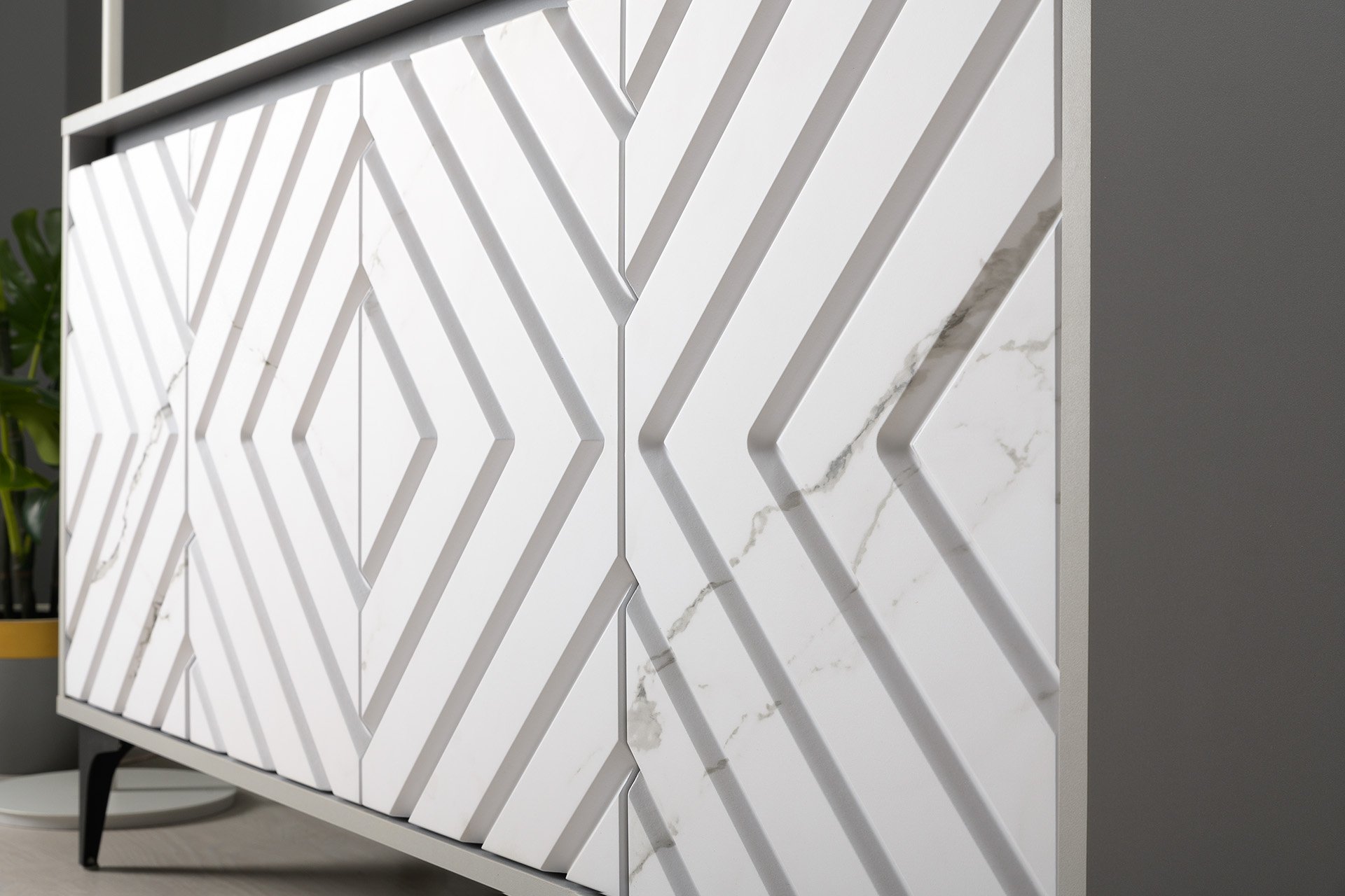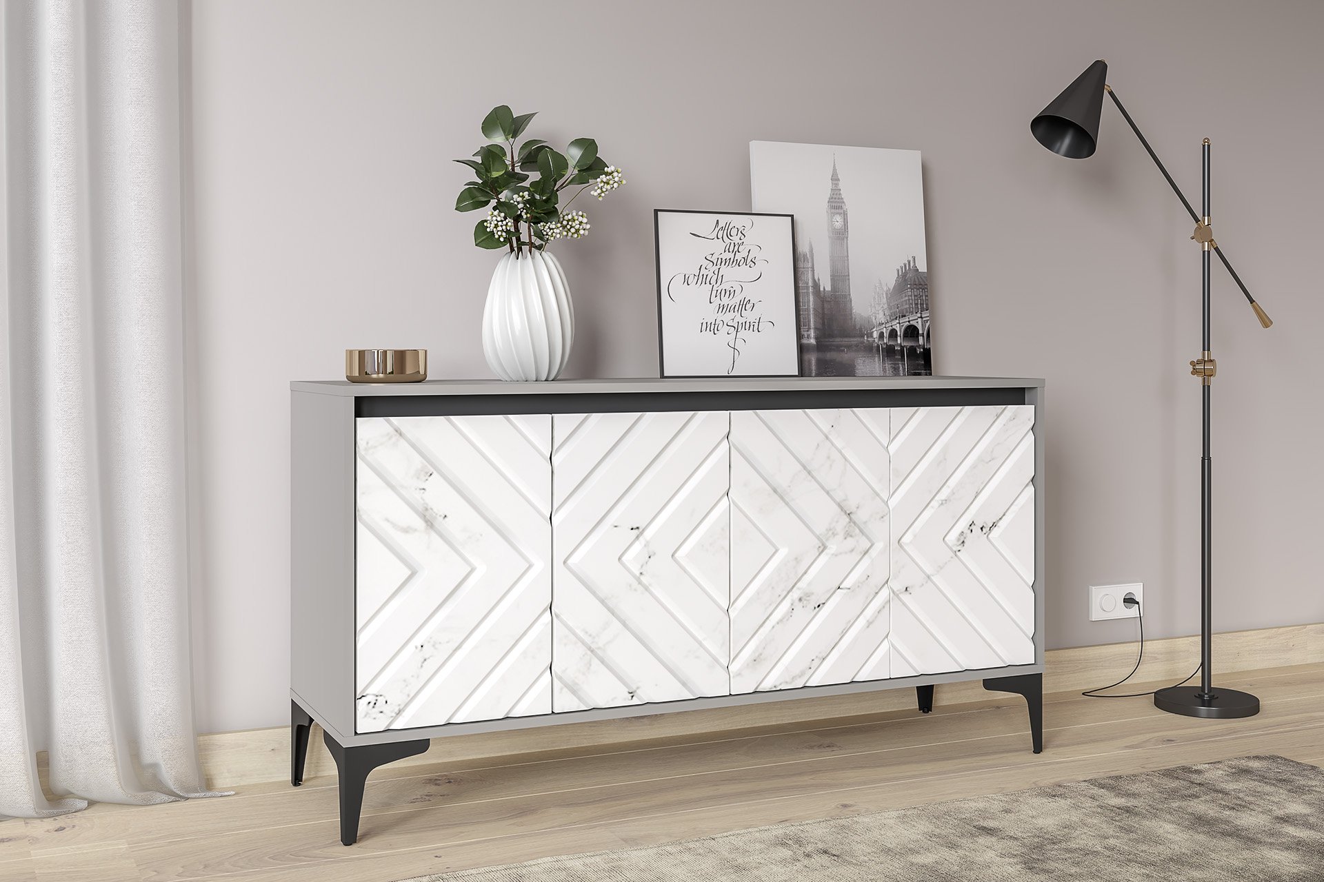 Светлый серый цвет корпуса является аккуратным обрамлением для фасадов с мраморным декором.